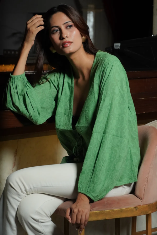 - Sleeves: Voluminous sleeves with elasticated cuffs.
